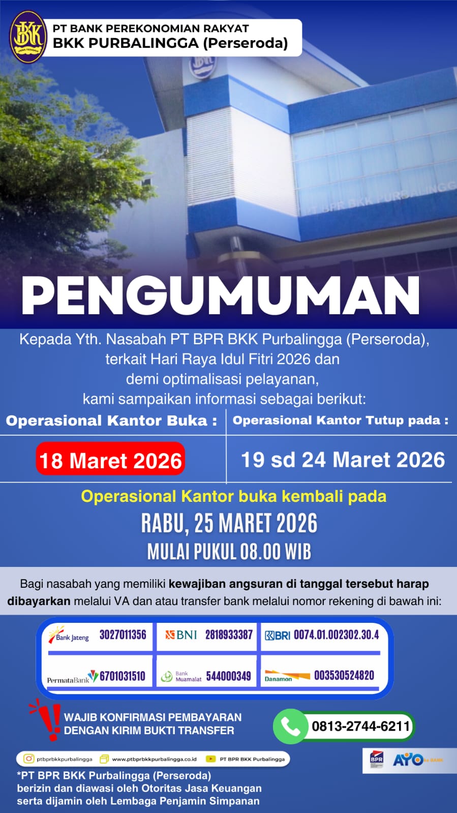 Home Undian Pengumuman Hari Operasional di Cuti Bersama dan Libur Idul fitri Tahun 2026 Pengumuman Hari Operasional di Cuti Bersama dan Libur Idul fitri Tahun 2026 BPR BKK PURBALINGGA Undian 25 Mar 2026, 15:20:44 WIB 0 Previous Article PENGUMUMAN PRAKUALIFIKASI ULANG PENGADAAN JASA DUE DILIGENCE BPR No Next Article Tidak ditemukan Artikel Setelahnya!!!